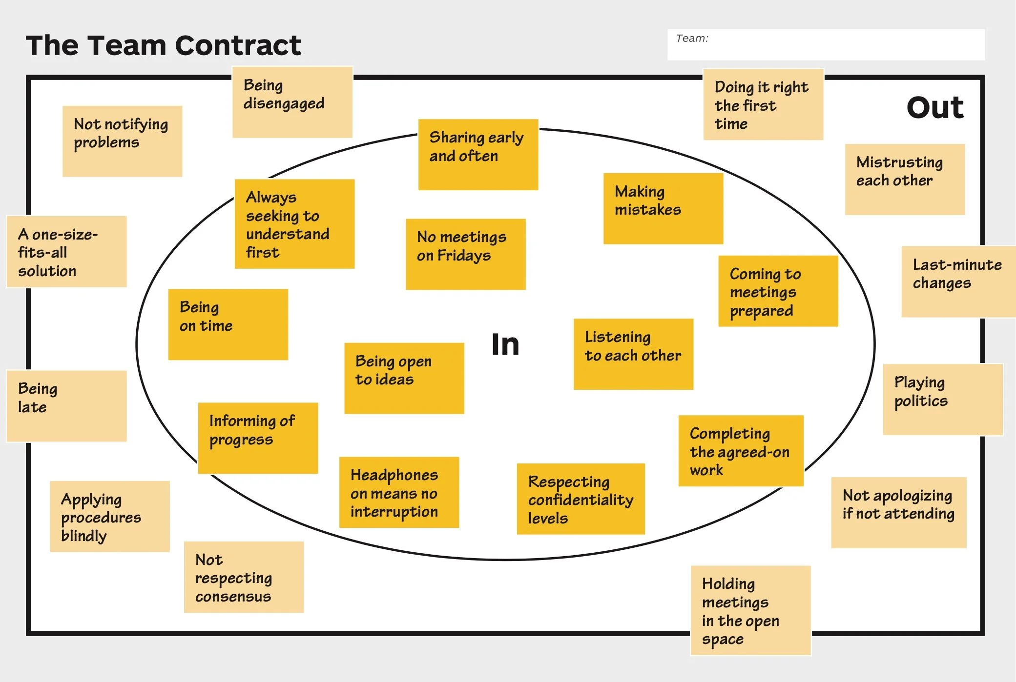 Its usefulness, in part, lies in its simplicity and approachability. It relies on participants defining what’s “in” or accepted behavior and what’s “out” or unacceptable behavior. Tactically, team members capture behaviors and expectations on digital or physical sticky notes and place them on the canvas. Then, the team reviews the sticky notes and discusses the behaviors, expectations, and responsibilities. Once a consensus is reached, they commit to upholding the behaviors of the contract within the confines of the team and project. You may even consider printing the canvas as a poster and hanging it up in a shared workspace as a reminder of what was agreed to.
